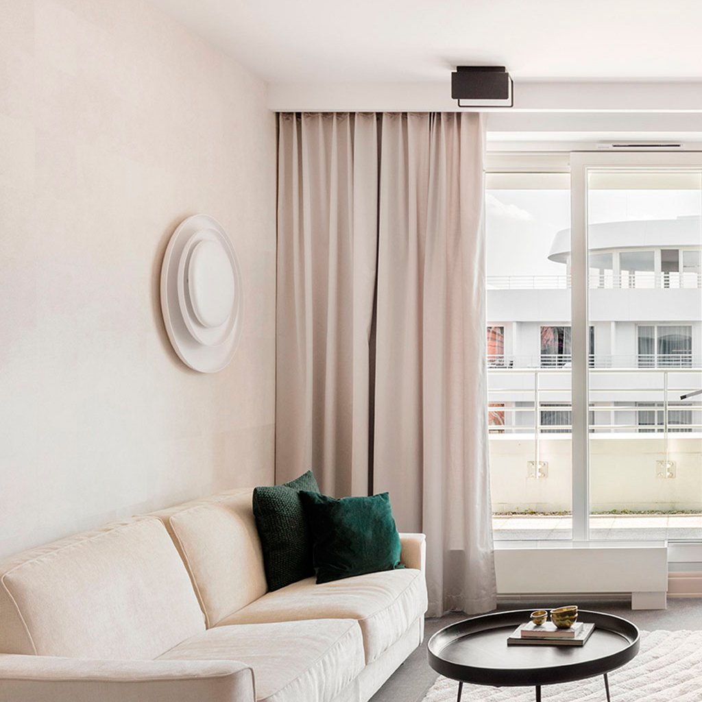 Asimétrica composición de formas, Bahia es una lámpara de techo y pared de gran tamaño que decora e ilumina con su escenográfica esencialidad y su mágico juego de sombras y resplandores.