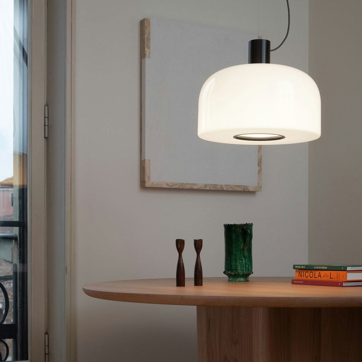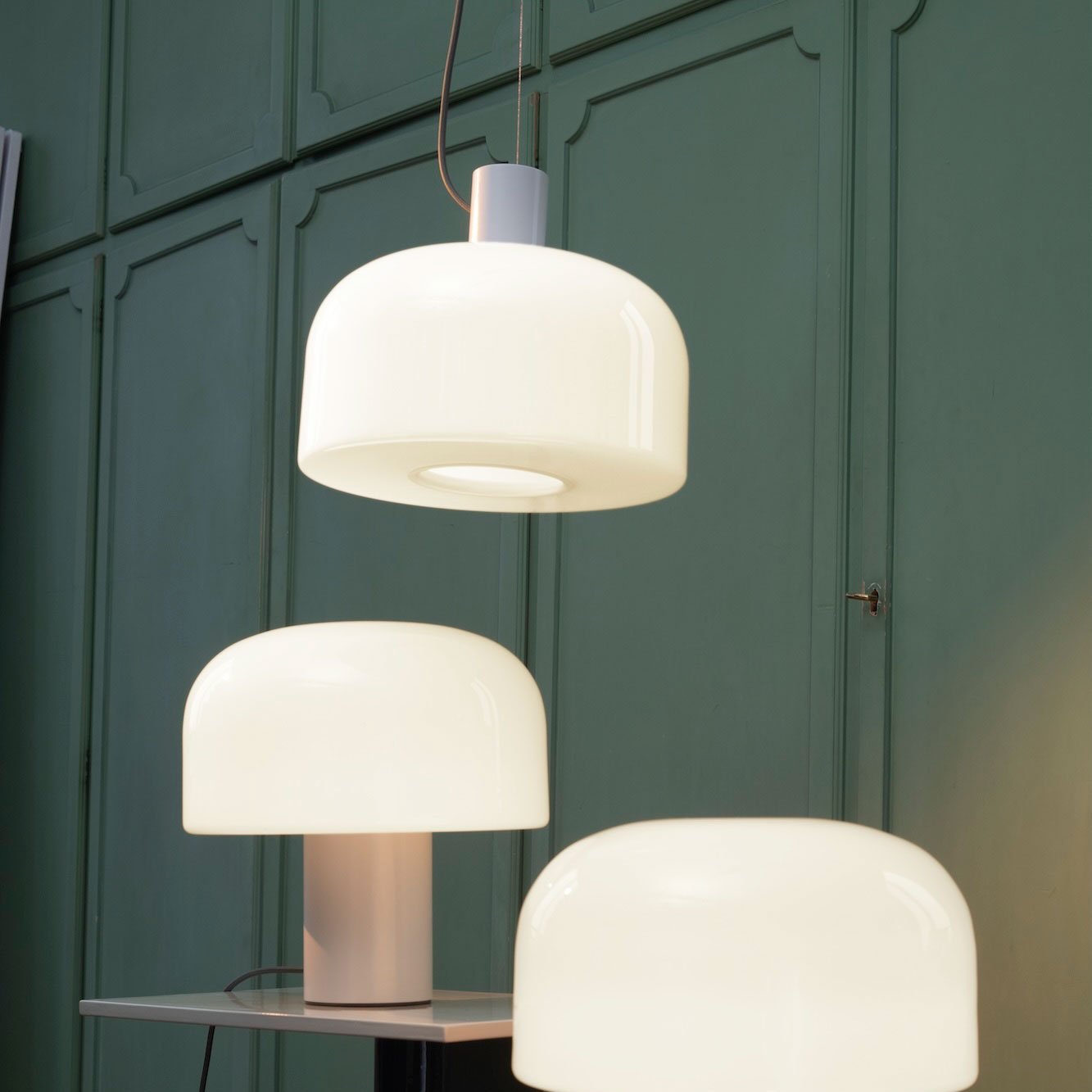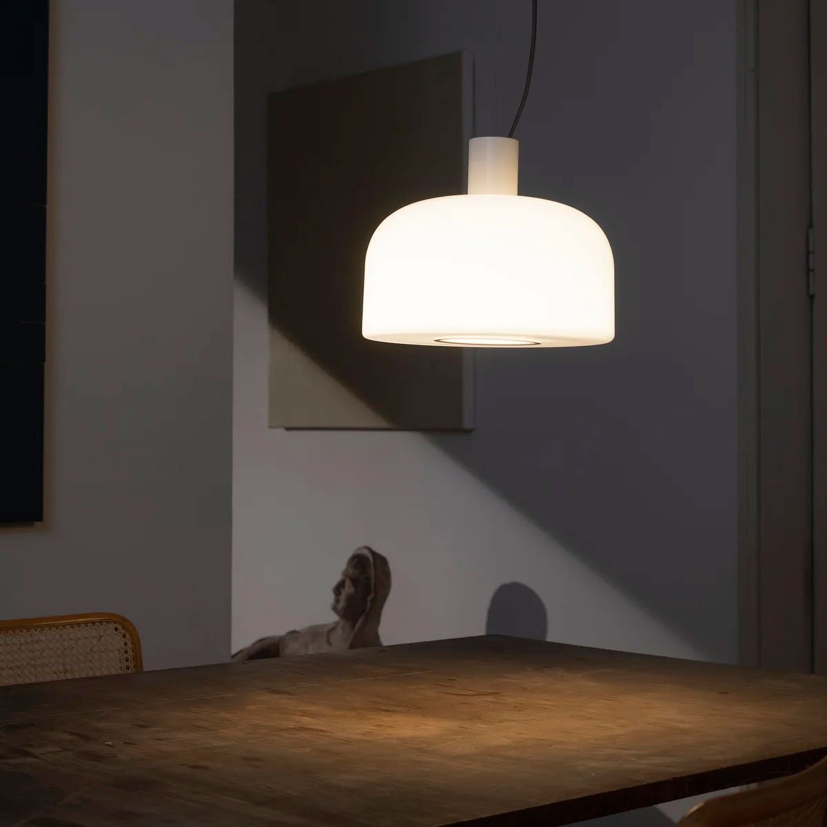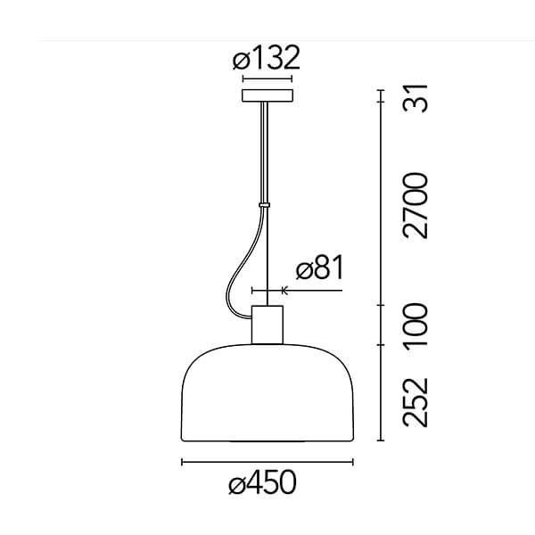 Colgante italiano de luz difusa/directa. Se caracteriza por un difusor con una triple capa de vidrio opalino.