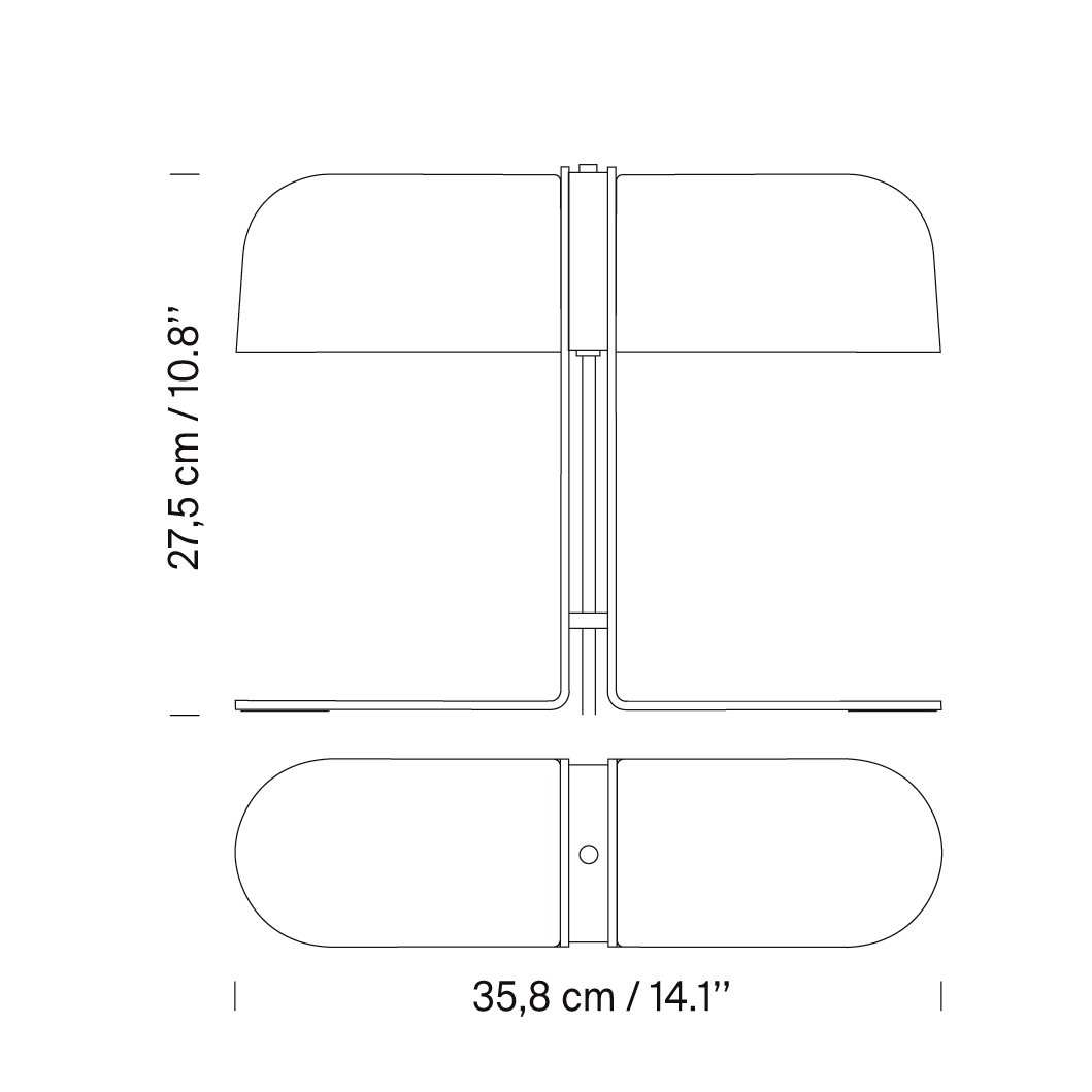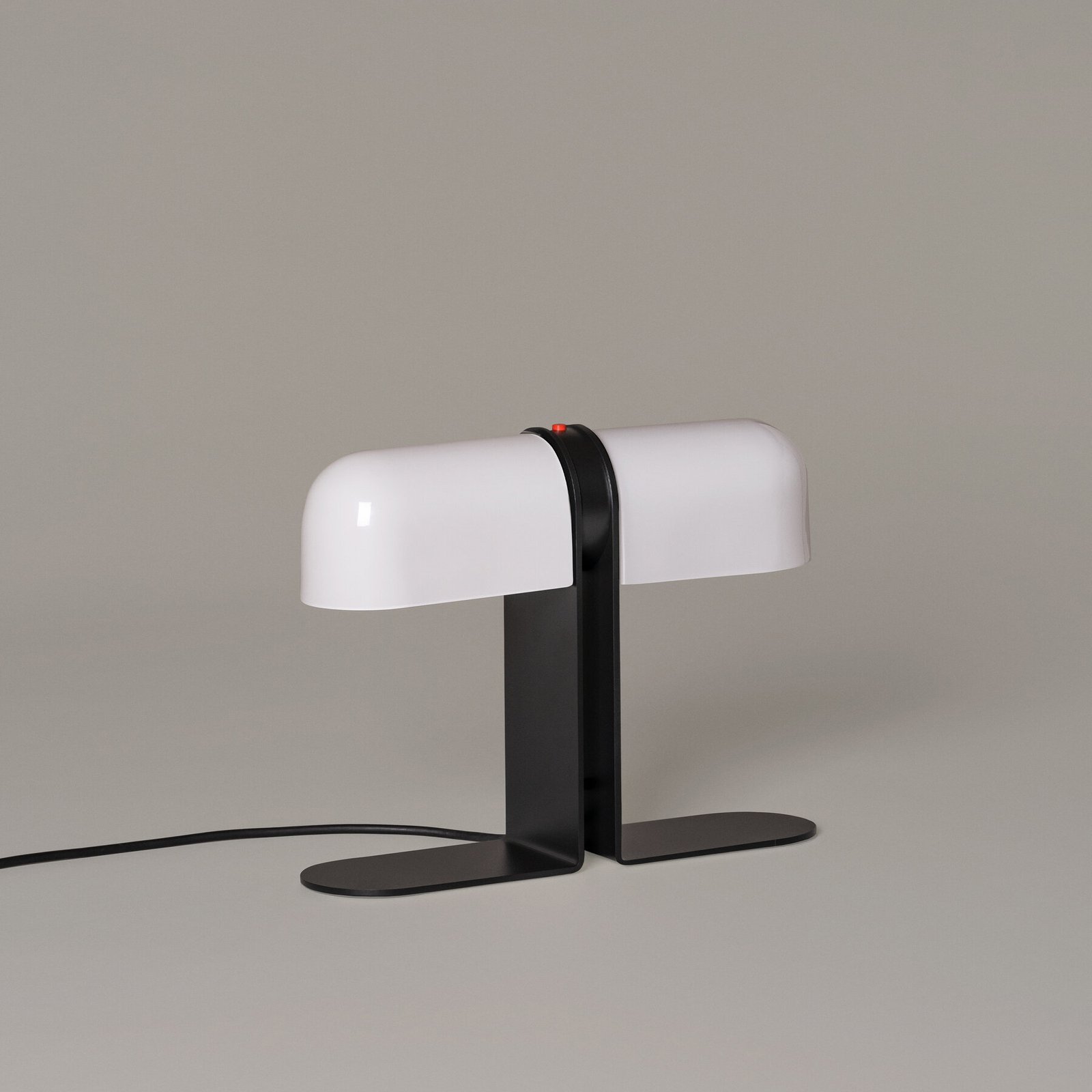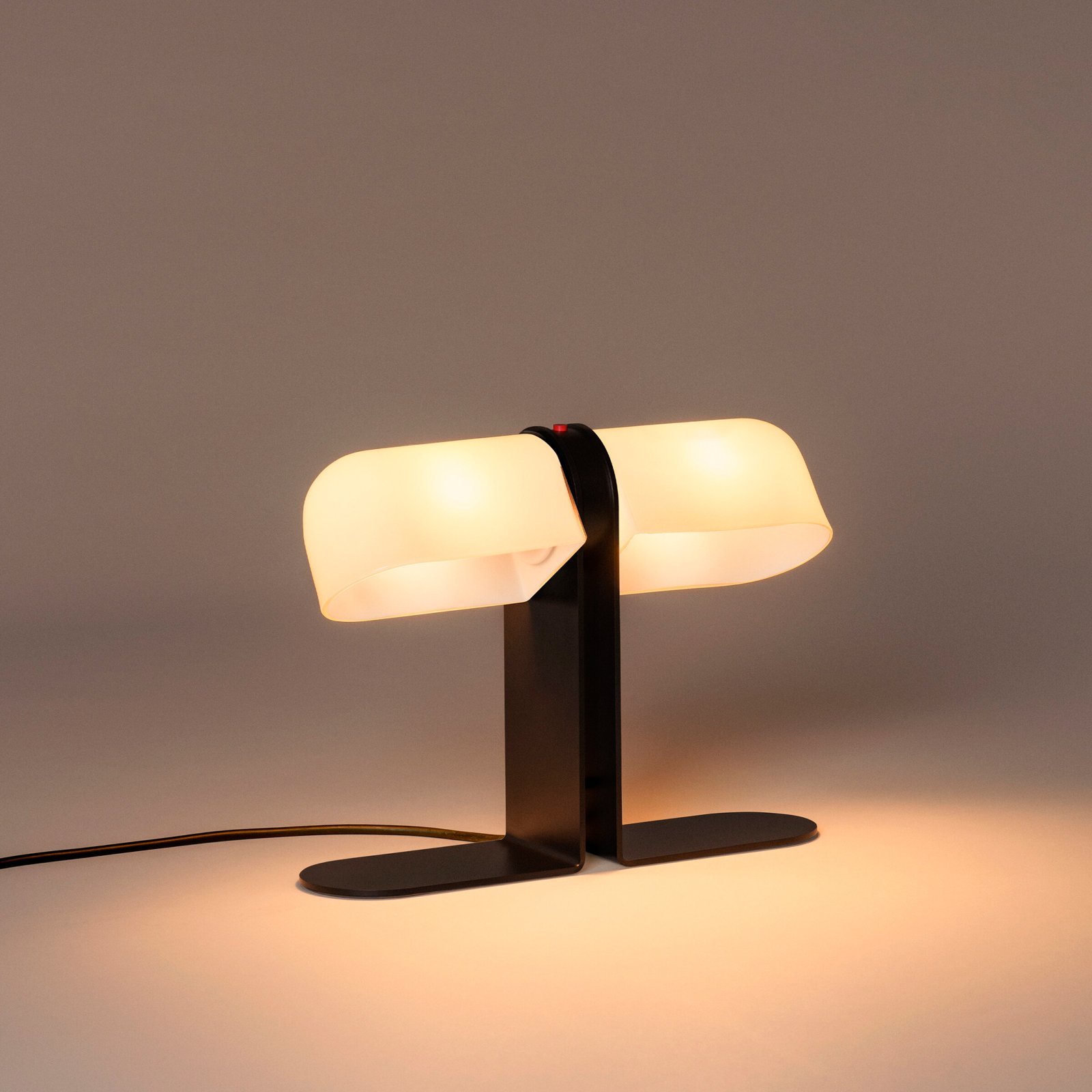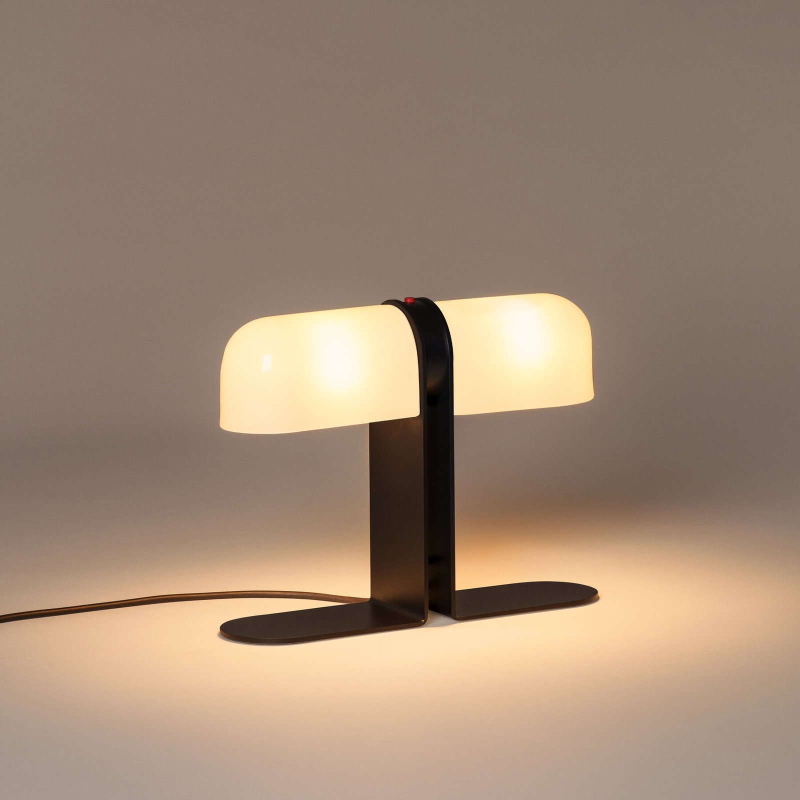 Lampara de mesa de luz difusa. La salida de luz es ajustable gracias a la rotación independiente de sus pantallas de vidrio, que pueden ser opacas para enfocar la luz sobre la superficie de trabajo o translúcidas para proporcionar una iluminación ambiental general. Un prominente pulsador ubicado en el estrecho cuerpo central sirve como interruptor para ambos.