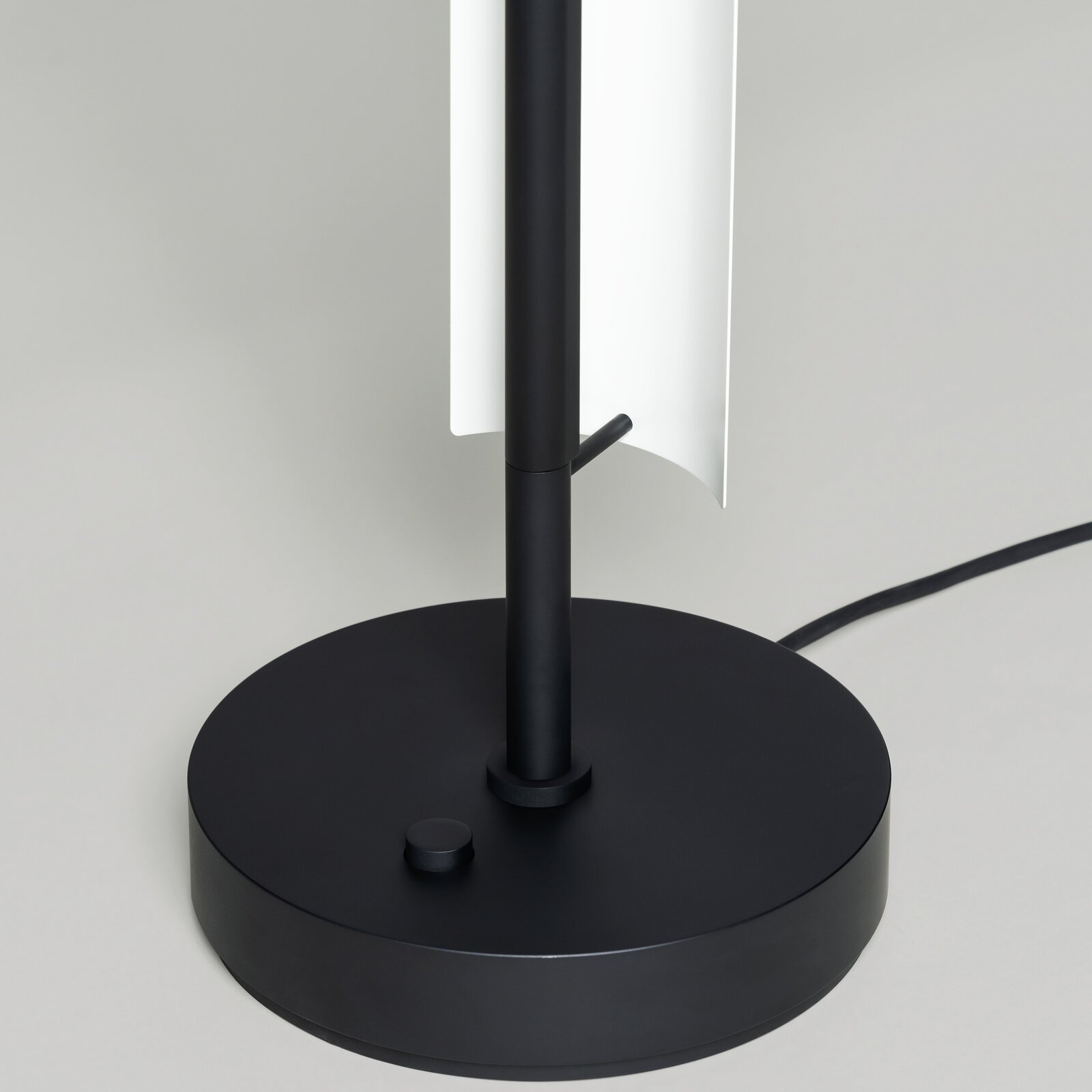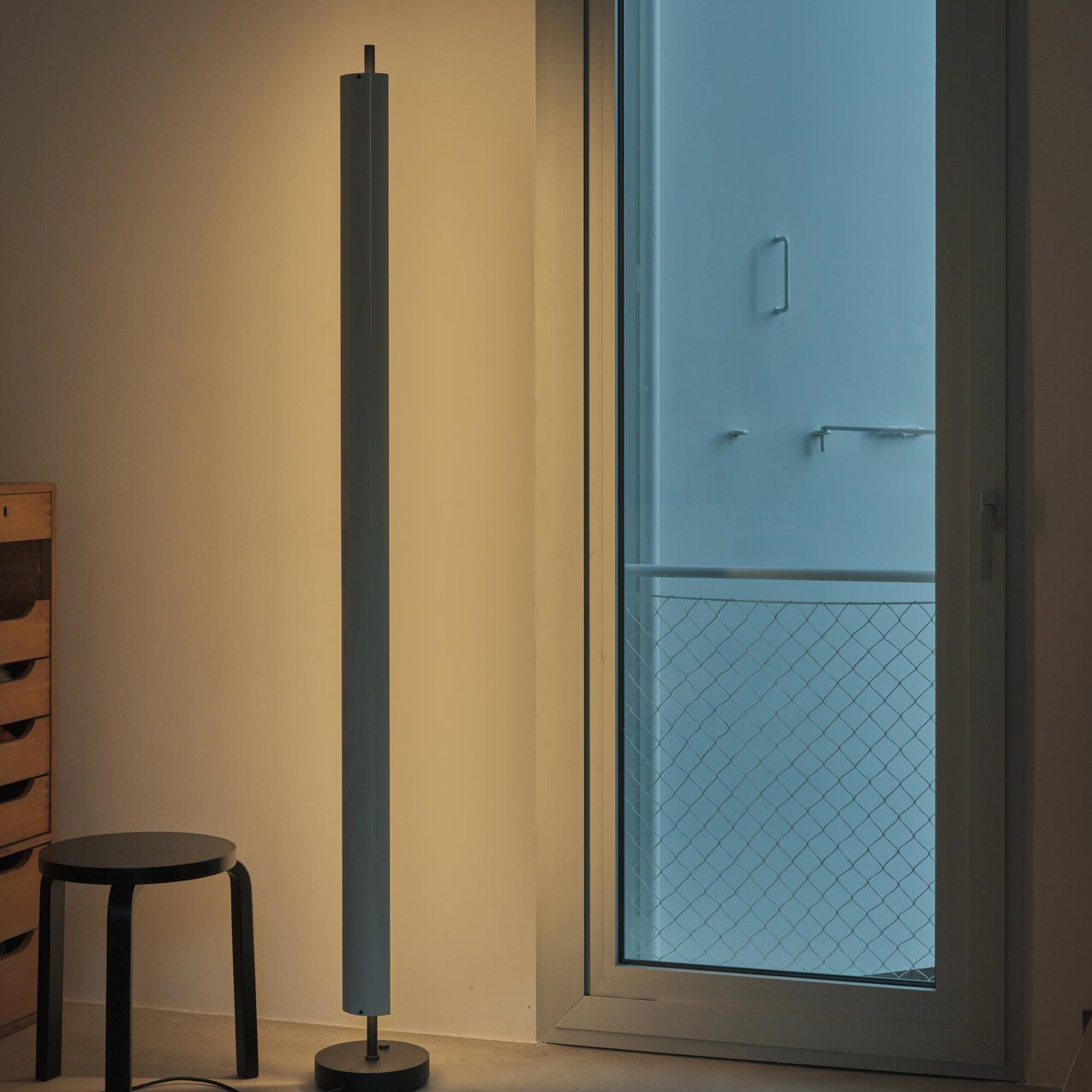 Lampara de pie de luz indirecta. Una línea de luz y una fina lámina de aluminio. Su superficie cóncava en blanco mate garantiza una calidad de luz óptima sin deslumbramientos, mientras que el reverso brillante proporciona un efecto visual refinado.