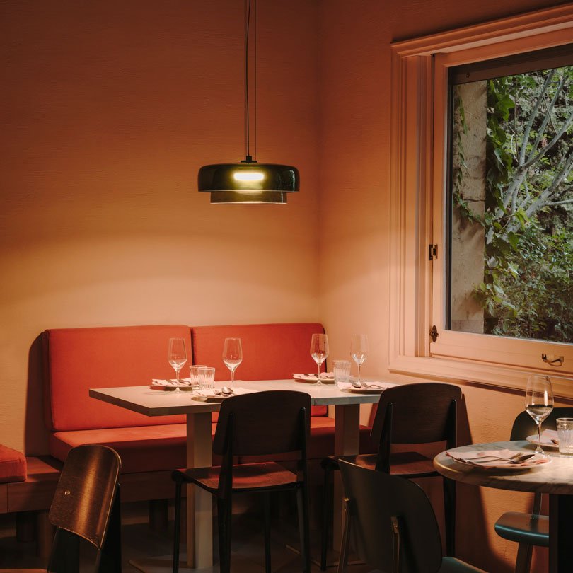 Colgante de luz difusa con doble pantalla de vidrio soplado.