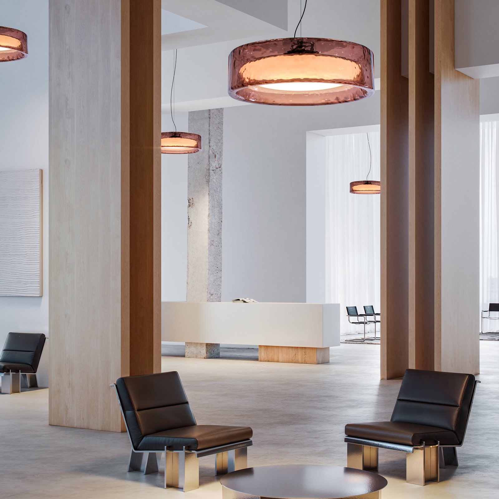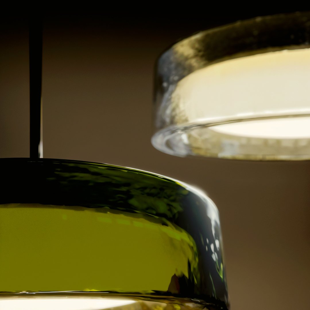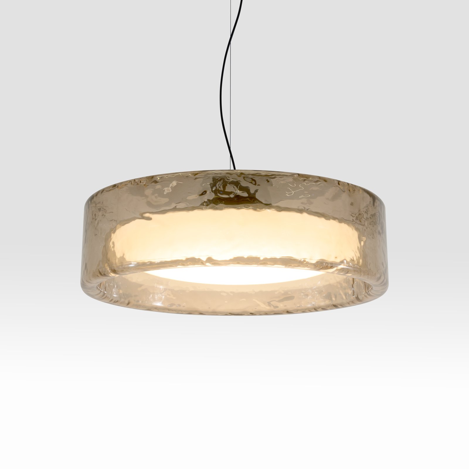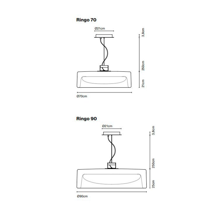 Lampara colgante de luz difusa. Ringo propone un diálogo entre la luz y la materia. Apagada es un objeto contundente, con mucha presencia, y si está encendida su transparencia define el volumen y filtra la luz.