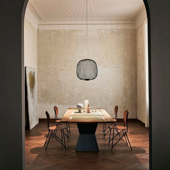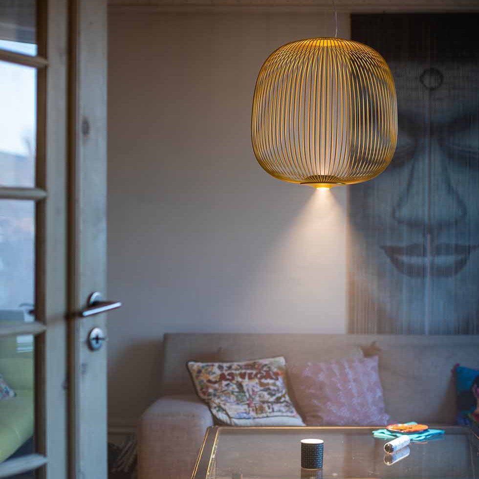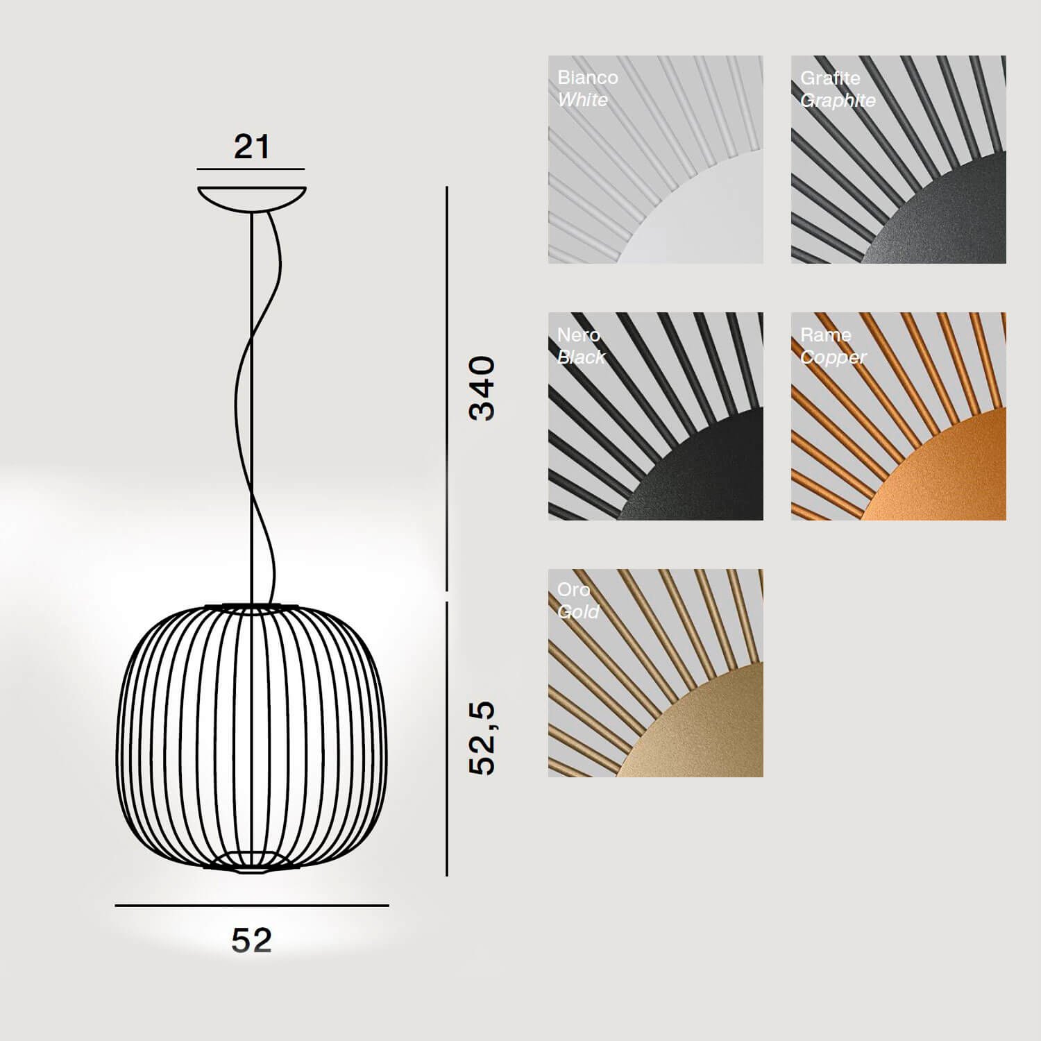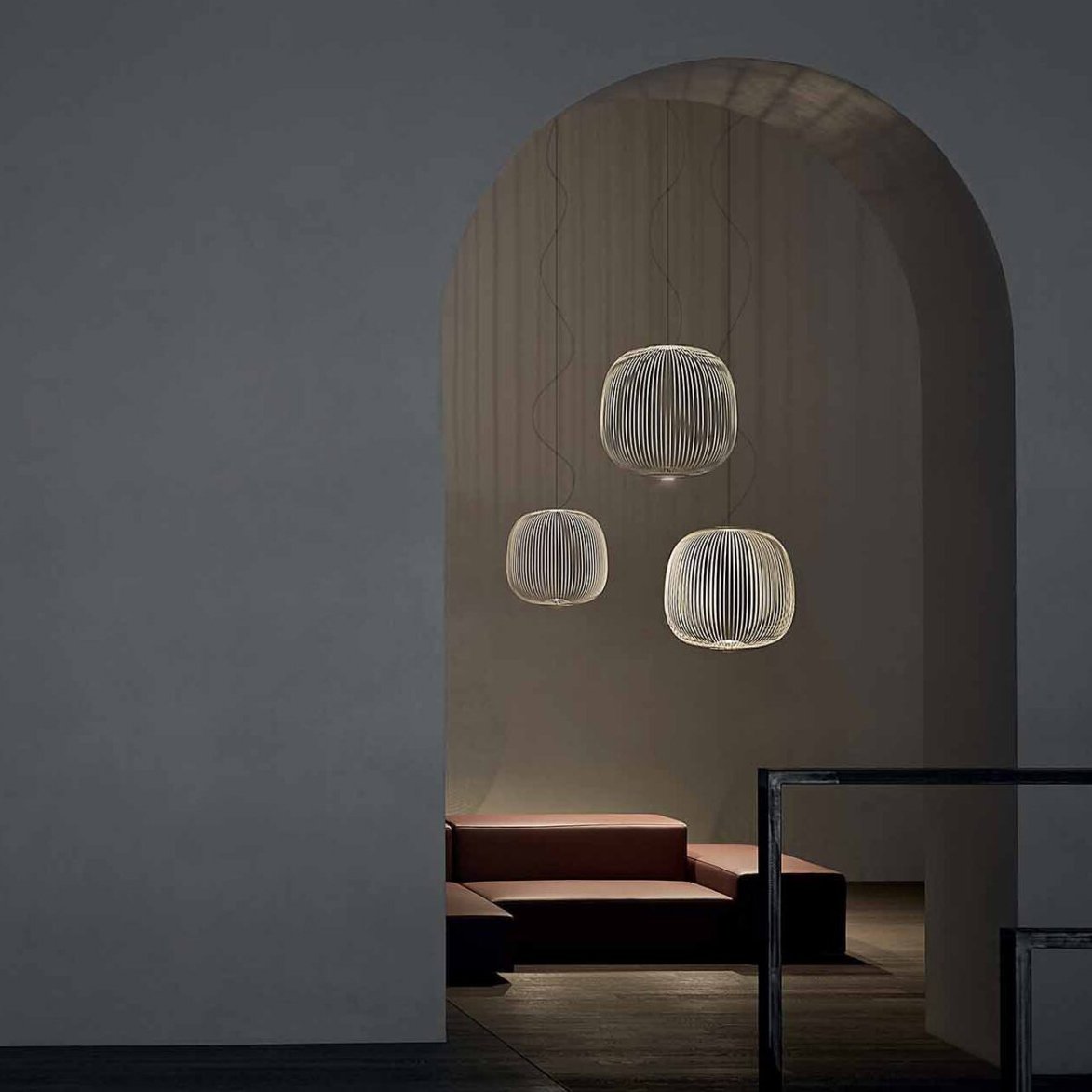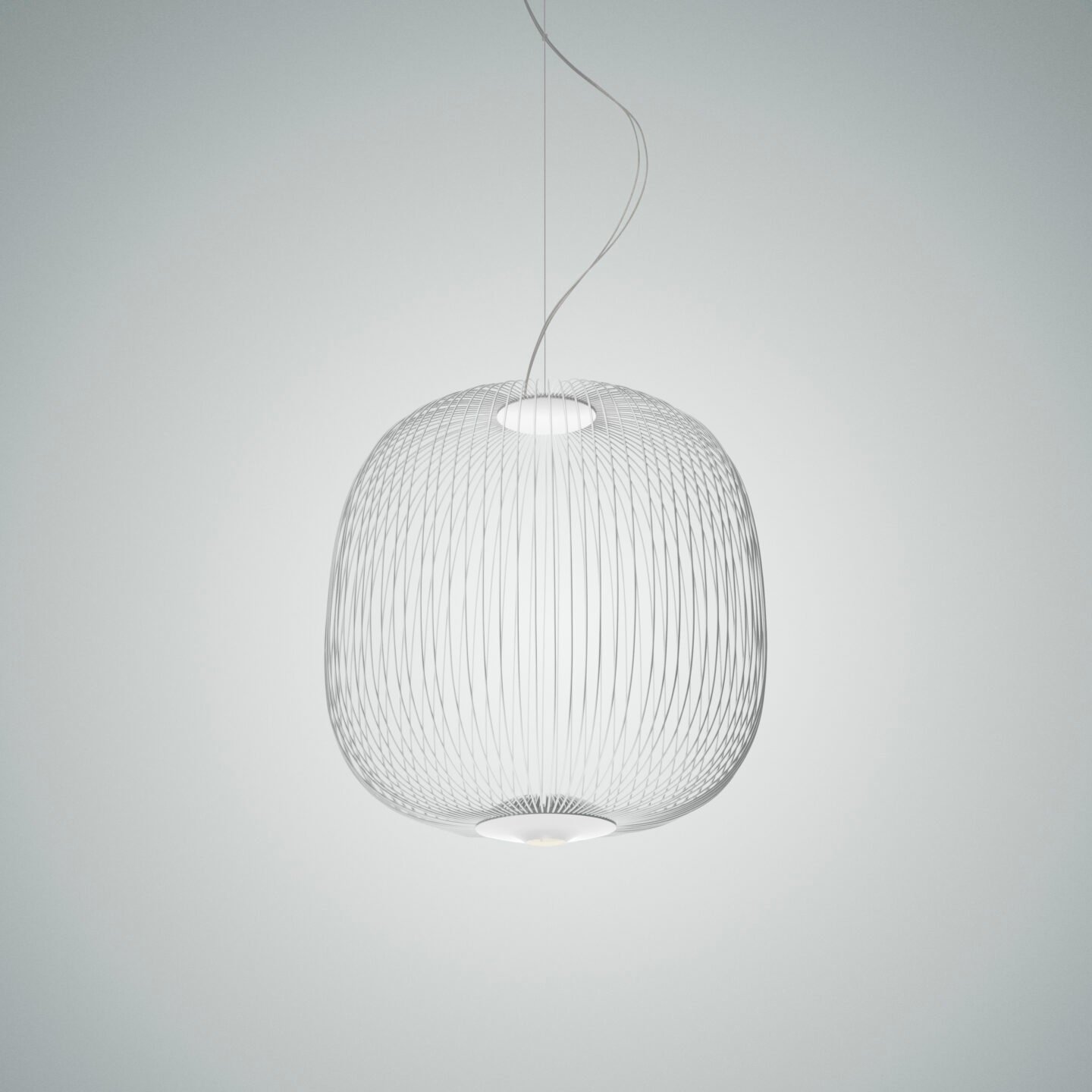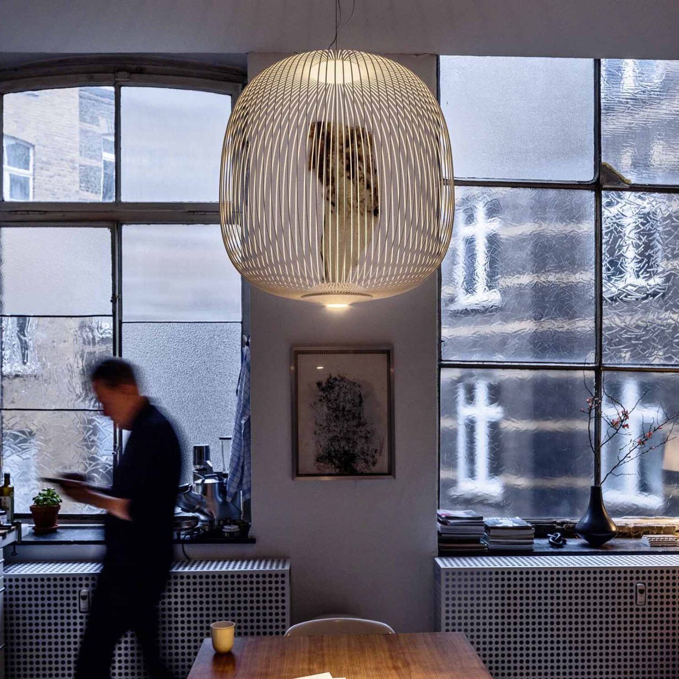 Spokes expresa una sensación de ligereza y movimiento. Como a través de un mágico y geométrico retículo, la luz filtra desde el interior, proyectando una luz puntual y una difusa a su interior.