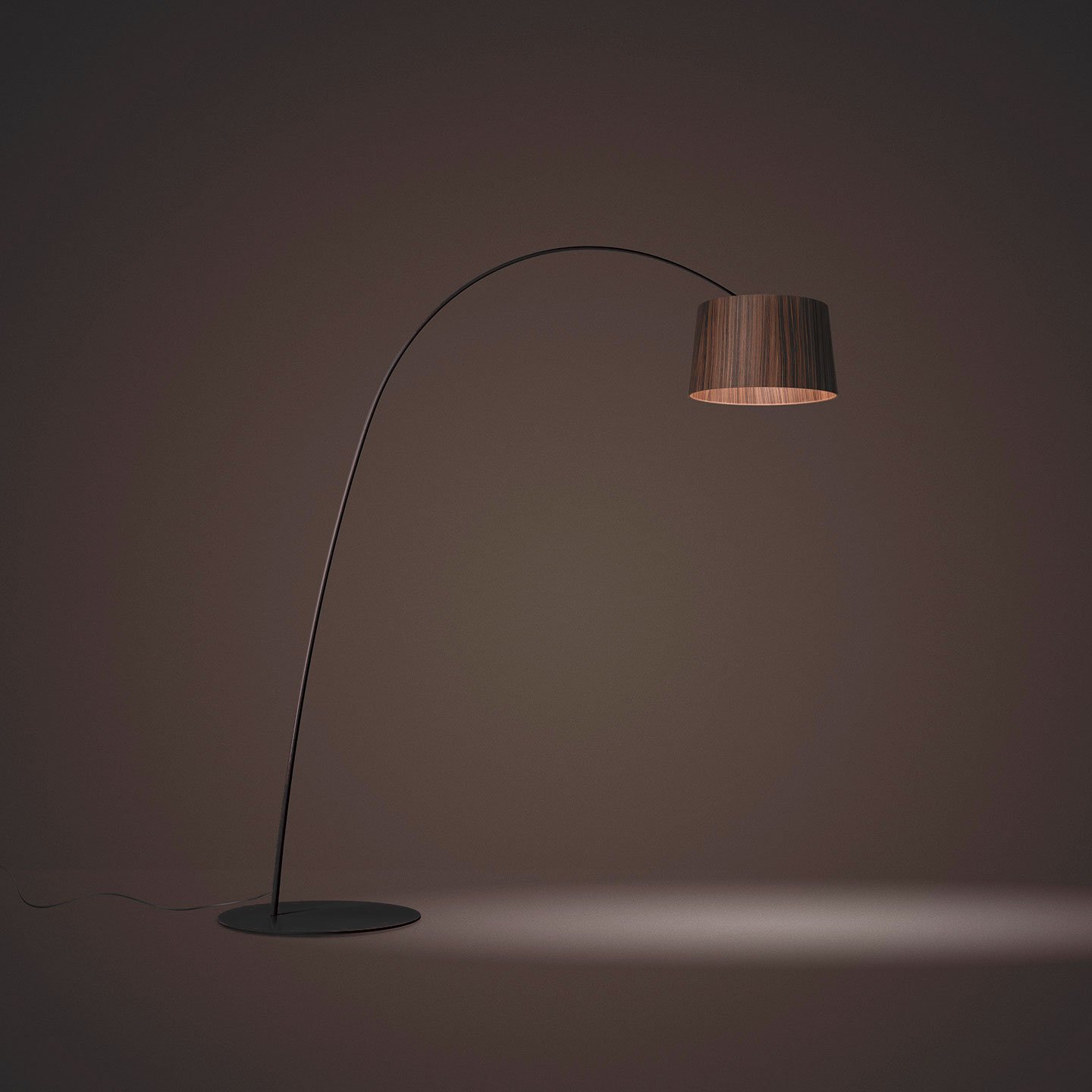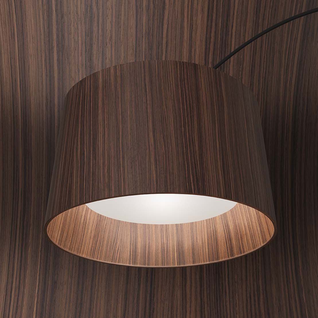Lámpara de pie arco italiana de luz directa con cuerpo de fibra de vidrio y pantalla de madera.